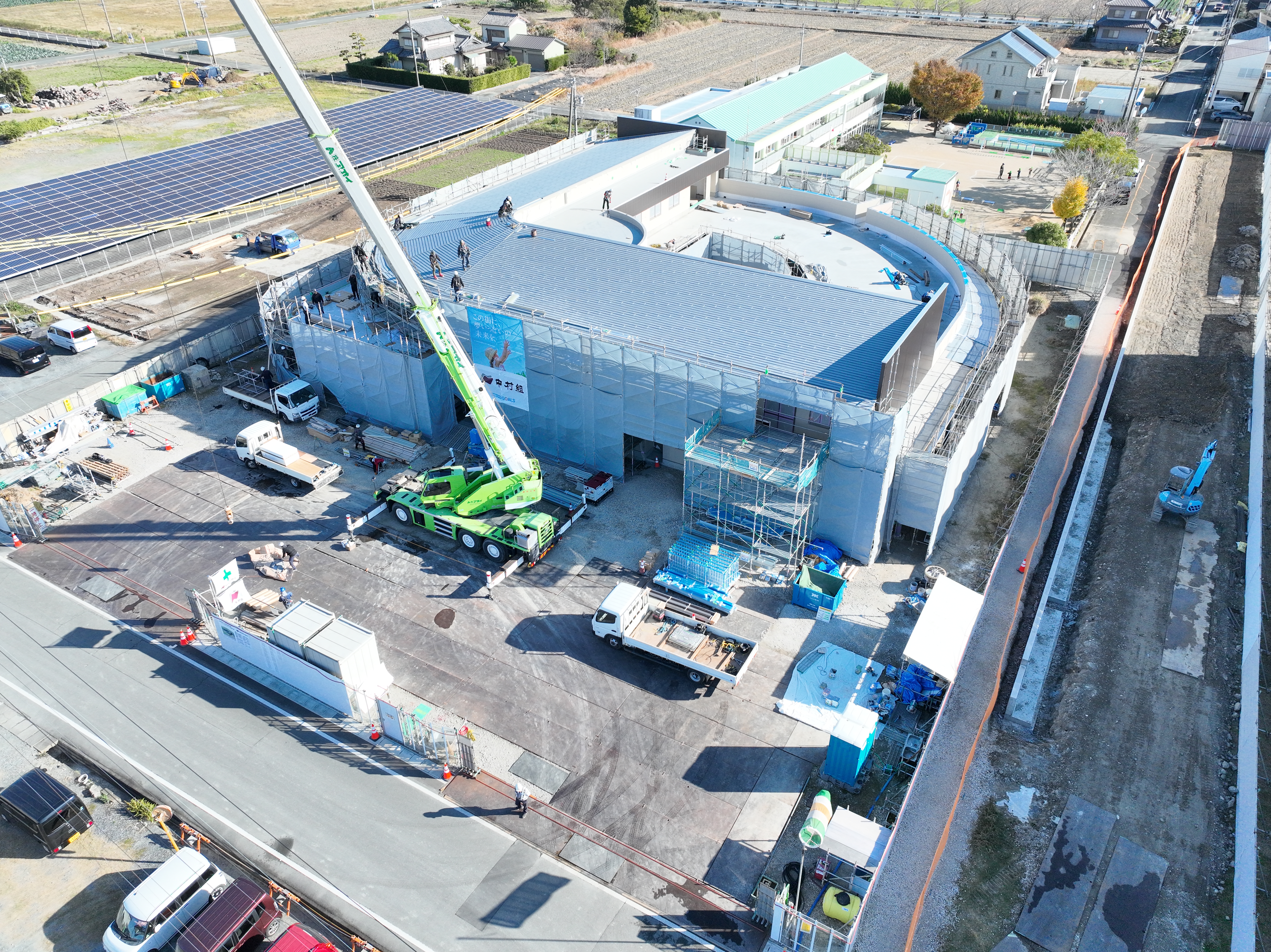 園舎、駐車場です。最近西側の足場が外れ園舎が見えるようになりました。